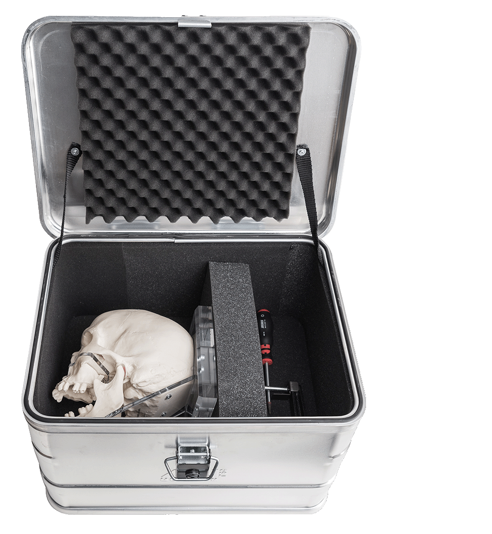 Die Aluminium-Transportbox mit Schaumstoffauskleidung sorgt schließlich, insbesondere bei Hands-on-Kursen, für den sicheren Transport Ihres Phantomschädels Serie A und der zugehörigen Modelle des Ober- und Unterkiefers.